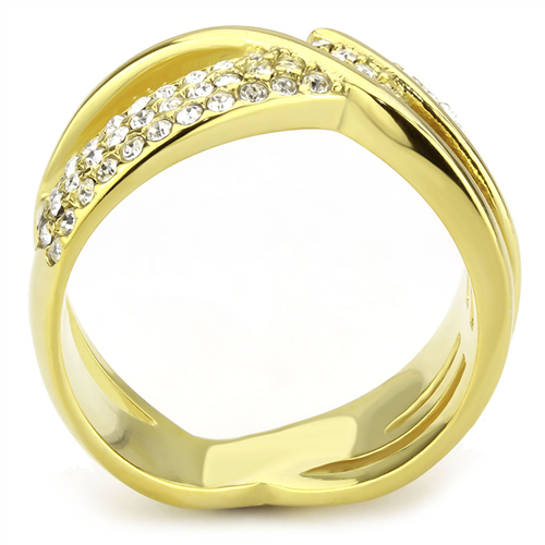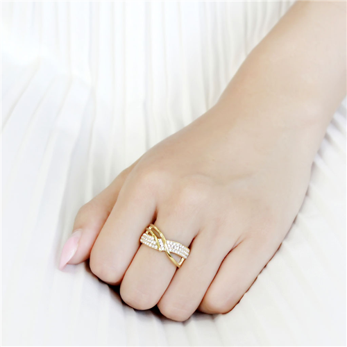 Čudovito izdelan čaroben prstan iz nerjavečega kirurškega jekla je prekrasno geometrično izdelan, prepletajočega izgleda z rumeno IP pozlato in izjemno ljubkih kristalov CZ v beli barvi. Kristali so visoke kakovosti in prečudovito lomijo svetlobo.