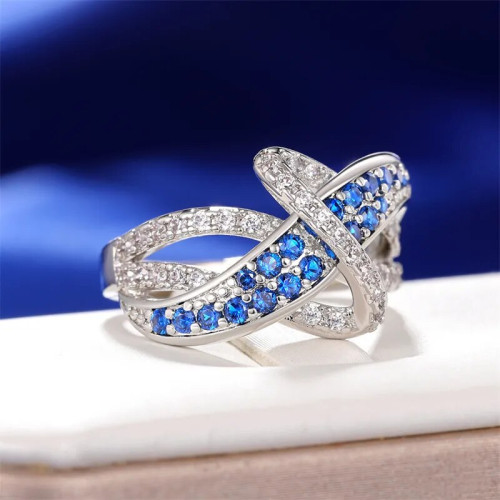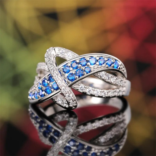 Prekrasen prstan, primeren za posebne in vsakodnevne priložnosti. Srebrnega videza z dodanimi belimi in modrimi kristali Cubic Zirconia. Čudovito darilo zase ali presenečenje za prijateljico!