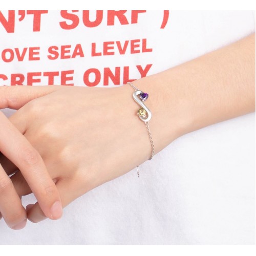 Elegantna in čutna zapestnica z znakom Infinity in kristaloma CZ v čarobni vijolični in rumeni barvi izjemne kakovosti, ki bo poudarila vašo garderobo.