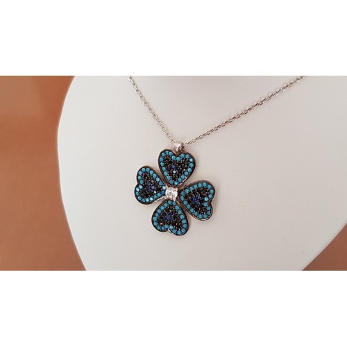 Srebrni obesek s čudovito in bogato deteljo, ki simbolizira srečo. Detelja je posuta z najrazličnejšimi čudovitimi črnimi kristali CZ in modrimi opali. Na sredini obeska pa kraljuje večji, čudovit bel kristal. Izjemen za popestritev vsakdanje garderobe.