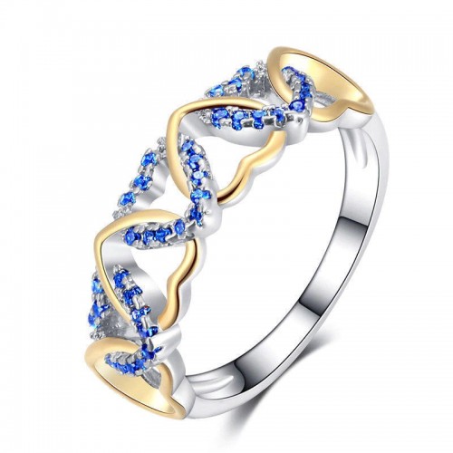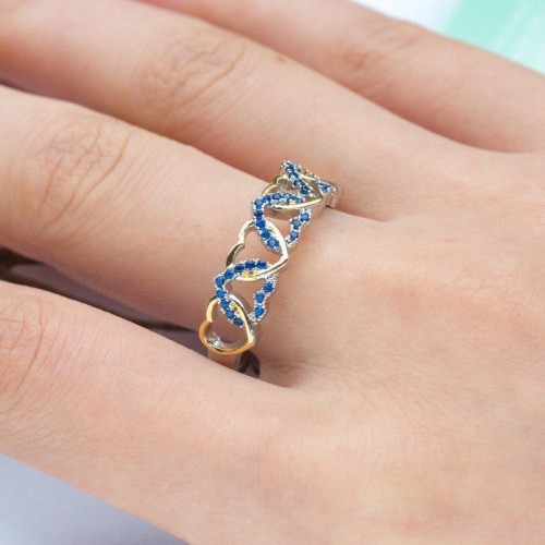 Tako zelo zanimiv in edinstven srebrn prstan, da ga ne smete zamuditi. Čudovit dizajn je dopolnjen z majhnimi kraljevsko modimi kristali CZ, ki tvorijo srca ta pa se prepletajo s srci z rumeno pozlato 18K, izjemne kvalitete. Kristali so izjemno visoke kakovosti in prečudovito lomijo svetlobo.