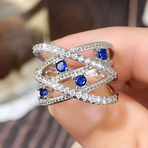 • Prekrasen prstan, primeren za posebne in vsakodnevne priložnosti. Srebrnega videza z dodanimi modrimi in belimi kristali Cubic Zirconia. Čudovito darilo zase ali presenečenje za prijateljico!