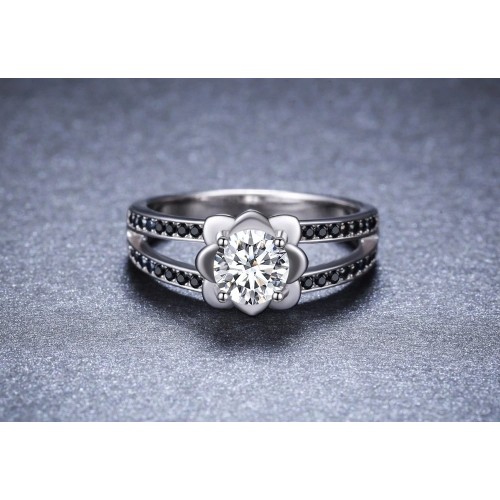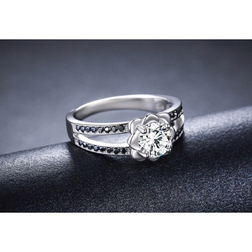 Izjemno zapeljiv srebrn prstan, bogato okrašen z majhnimi kristali CZ v črni barvi, na sredini pa zaključen z večjim, udarnim kosom, kristalom CZ, ki meri 6 mm premera. Tega obkrožajo tudi srebrni cvetni lističi za še bolj romantičen izgled, saj deluje kot izjemno lep cvet. Kristali so visoke kakovosti, ki prečudovito lomijo svetlobo.
