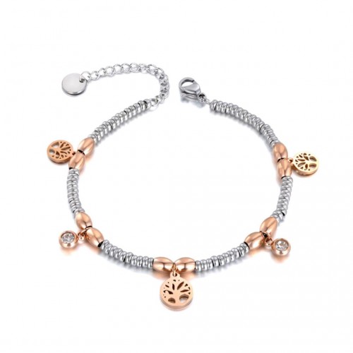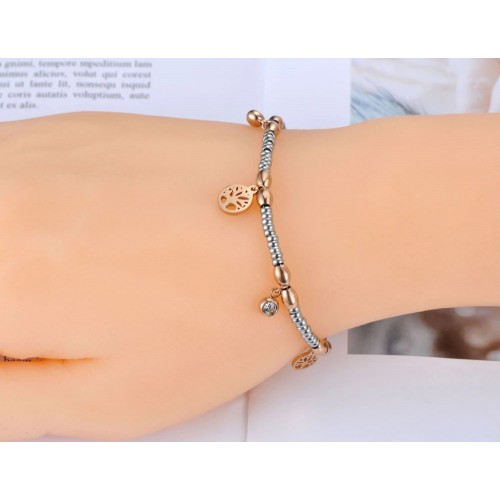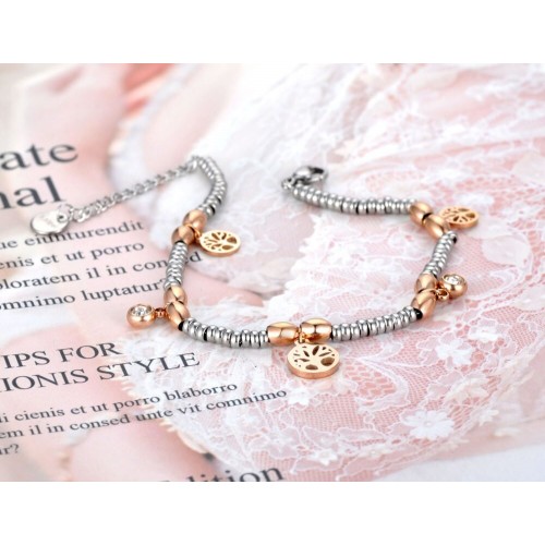 • Prekrasna sestavljena zapestnica iz nerjavečega jekla in trikratno 18K belo IP pozlato in občasnimi detajli v 18K pozlati Rose gold pozlati. Amuleti, ki se pojavljajo simbolizirajo drevo, ki predstavlja družino in povezanost družine. Zapestnici sta dodana dva kristala CZ bele barve in izjemne kvalitete, ki prečudovito lomita svetlobo. Lahko je izjemno darilo za ljubljene osebe.