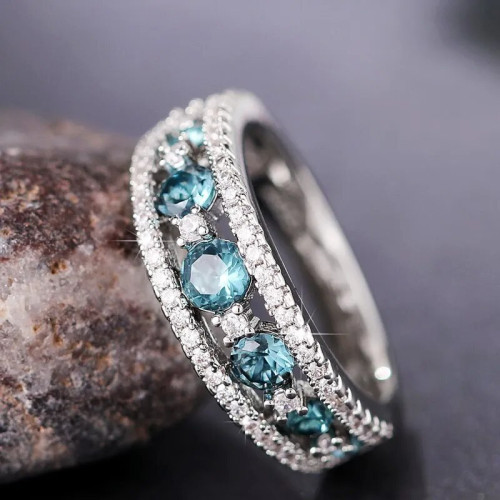 Osvežujoč eleganten prstan, primeren za posebne in vsakodnevne priložnosti. Srebrnega videza z dodanimi belimi in modrimi kristali Cubic Zirconia. Čudovito darilo zase ali presenečenje za prijateljico!