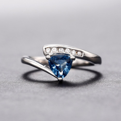 Prekrasen prstan v modernem dizajnu. Okrašen z belimi kristali CZ in velikim modrim kristalom, ki daje prstanu unikaten videz.