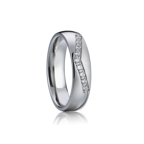 Zapeljiv prstan prekrasnega dizajna iz nerjavečega kirurškega jekla. Okrašen s CZ kristali. Primeren za vsak dan, kot čudovito darilo ali zaroko, saj kar žari od silne zaljubljenosti katera je dana vanj.